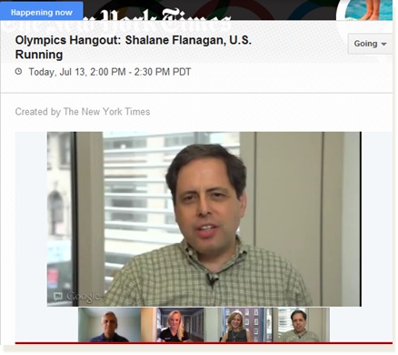 I attended my first Google+ Event this week. It had no physical venue, taking place exclusively on Google+ and YouTube. The New York Times hosted the event. In the lead-up to the 2012 Olympics, the Times has been hosting Google+ Hangouts with Olympians. I came across the Hangouts while visiting the Times’ London 2012 Olympics page.